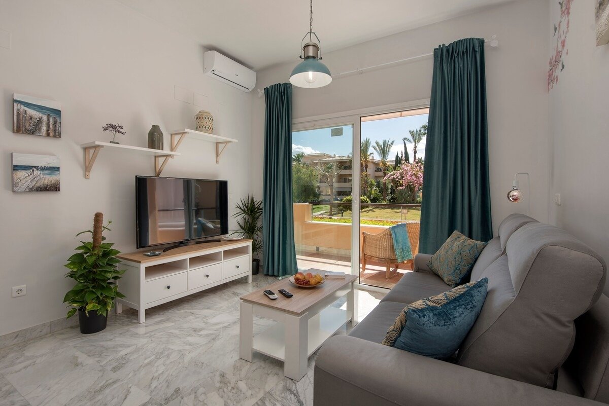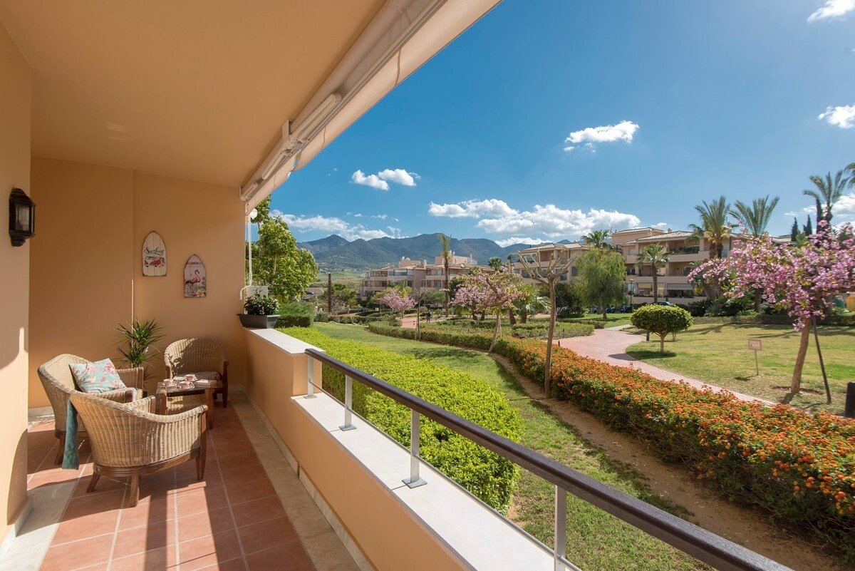 Apartamento exclusivo en complejo con vigilancia 24 h, jardines, lago, piscinas (abiertas de mayo a septiembre), gimnasio y zonas deportivas gratuitas. Cuenta con aparcamiento y un café-bar junto a la piscina. A minutos de Lauro Golf y del centro budista Kadampa.